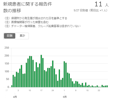 東京都は5月27日、都内の医療機関から報告された新型コロナウイルス感染症の新たな患者は11人、そのうち感染経路不明は8人などと発表した。死亡は4人増えて296人、患者総数は5180人。西東京市は変化なく14日間連続46人だった。