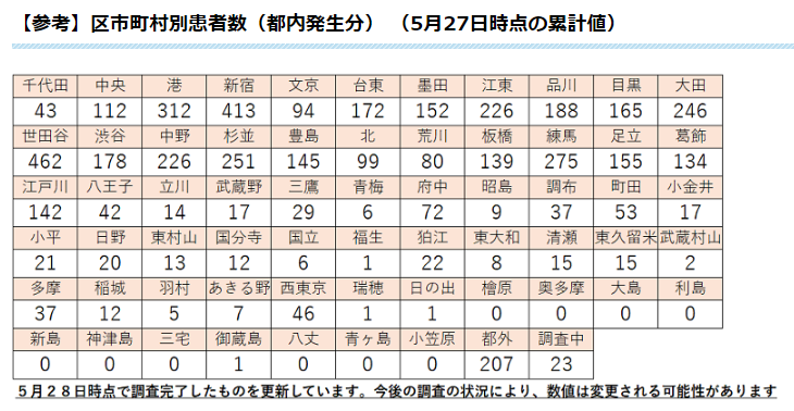 区市町村別の上位は5月27日の時点で、世田谷区462人(+2)、新宿区413人(+1)、港区312人(+3)、練馬区275人(0)、杉並区251人(+1)となった。