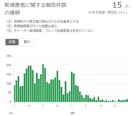 東京都は5月28日、都内の医療機関から報告された新型コロナウイルス感染症の新たな患者は15人、そのうち感染経路不明は8人などと発表した。死亡は3人増えて299人、患者総数は5195人。西東京市は変化なく15日間連続46人だった。