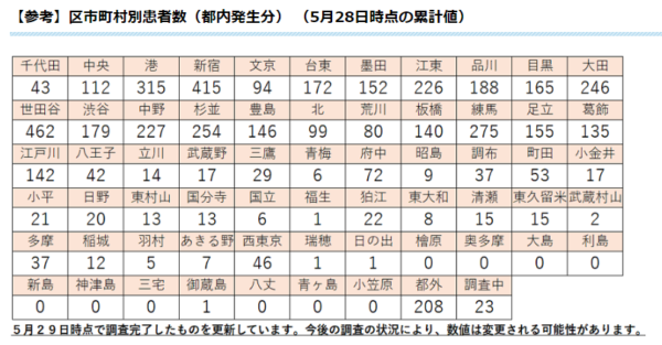 区市町村別の上位は5月28日の時点で、世田谷区462人(0)、新宿区415人(+2)、港区315人(+3)、練馬区275人(0)、杉並区254人(+3)となった。