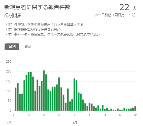 東京都は5月29日、都内の医療機関から報告された新型コロナウイルス感染症の新たな患者は22人、そのうち感染経路不明は13人などと発表した。死亡は3人増えて302人、患者総数は5217人。西東京市は変化なく16日間連続46人だった。