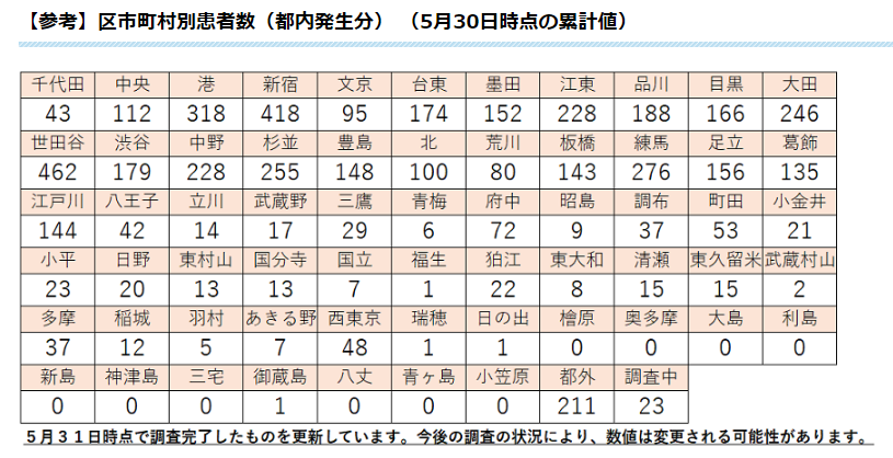 区市町村別の上位は5月30日の時点で、世田谷区462人(0)、新宿区418人(+1)、港区318人(+1)、練馬区276人(0)、杉並区255人(0)となった。