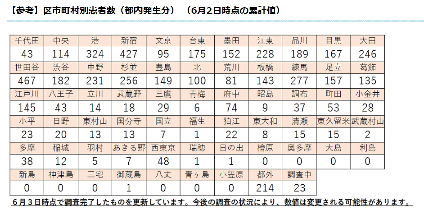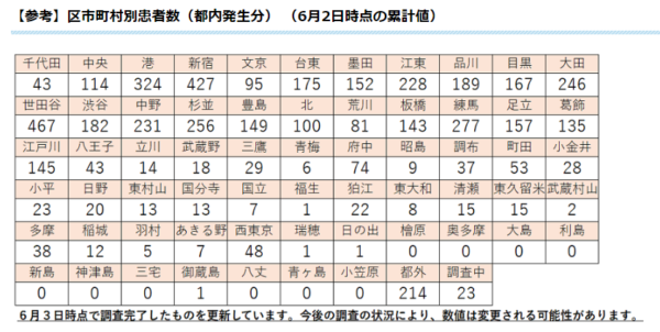 区市町村別の上位は6月2日の時点で、世田谷区467人(+1)、新宿区427人(+1)、港区324人(+6)、練馬区277人(+1)、杉並区256人(+1)となった。