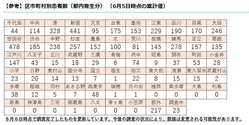 区市町村別の上位は6月5日の時点で、世田谷区478人(+2)、新宿区441人(+6)、港区328人(+1)、練馬区278人(0)、杉並区257人(+1)となった。
