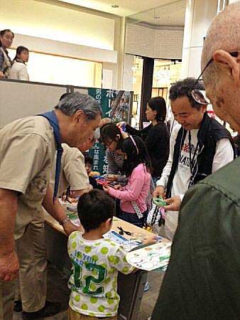 会場のイオンモールむさし村山には、今回の世界ジャンボリーのテーマでもある「平和」活動に参加してもらおうと、広島の平和記念式典に納める「折り鶴」作りのコーナーが設けられた。他には、縄結び体験、パネルに描かれた木の実の葉を当てるなどの自然クイズ、世界の国旗を記憶するゲームコーナーなども設置され、約400人の親子連れなどが参加。約400羽の折り鶴が完成した。