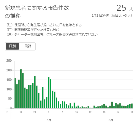 東京都は6月12日、都内の医療機関から報告された新型コロナウイルス感染症の新たな患者は25人、そのうち感染経路不明は7人などと発表した。年代別では20代が12人、30代が9人となり20~30代が8割を超えた。性別では男性が20人を占めた。死亡は前日より2人増え313人、患者総数は5473人。西東京市は13日続けて48人だった。