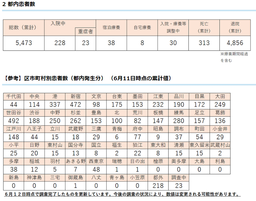 区市町村別の上位は6月11日の時点で、世田谷区492人(+1)、新宿区472人(+9)、港区337人(+1)、練馬区280人(0)、杉並区262人(0)となった。