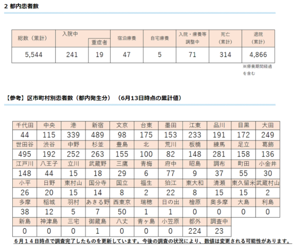 区市町村別の上位は6月13日の時点で、世田谷区495人(+2)、新宿区495人(+11)、港区339人(+2)、練馬区281人(+1)、杉並区263人(+1)などとなった。