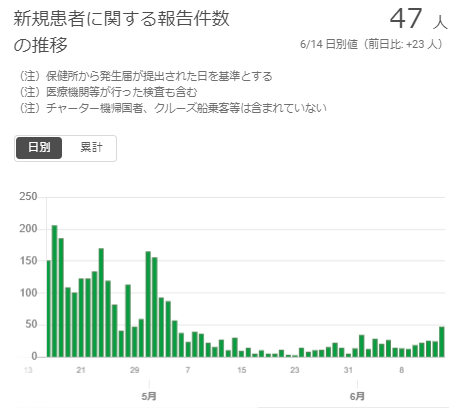 東京都は6月14日、都内の医療機関から報告された新型コロナウイルス感染症の新たな患者は47人、そのうち感染経路不明は10人などと発表した。患者が40人を超えたのは5月5日以来40日ぶり。年代別では20代が26人、30代が8人となり、20~30代が7割を超えた。性別では男性が34人を占めた。死亡は前日と同じ314人、患者総数は5544人。西東京市は連日の1人増で50人となった。