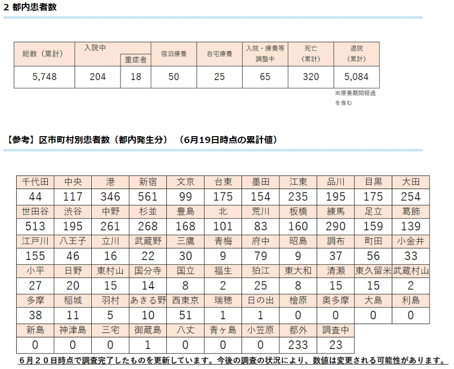 区市町村別の上位は6月19日の時点で、新宿区561人(+10)、世田谷区513人(+3)、港区346人(0)、練馬区290人(+3)、杉並区268人(0)となった。