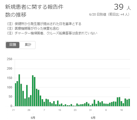 東京都は6月20日、都内の医療機関から報告された新型コロナウイルス感染症の新たな患者は39人、そのうち感染経路不明は15人などと発表した。年代別では20代が15人、30代が17人だった。性別では男性が32人、女性7人。死亡は前日と変わらず320人、患者総数は5748人。西東京市は5日連続51人だった。