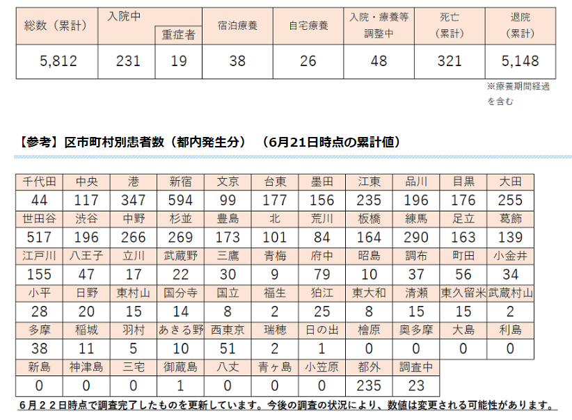 区市町村別の上位は6月21日の時点で、新宿区594人(+15)、世田谷区517人(+3)、港区347人(+1)、練馬区290人(0)、杉並区269人(+1)となった。