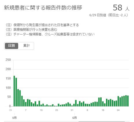 東京都は6月29日、都内の医療機関から報告された新型コロナウイルス感染症の新たな患者は58人、そのうち感染経路不明は24人などと発表した。4日連続患者が50人を超えた。年代別では20代が32人、30代14人。死亡は325人、患者総数は6171人。西東京市は前日と同じ54人だった。