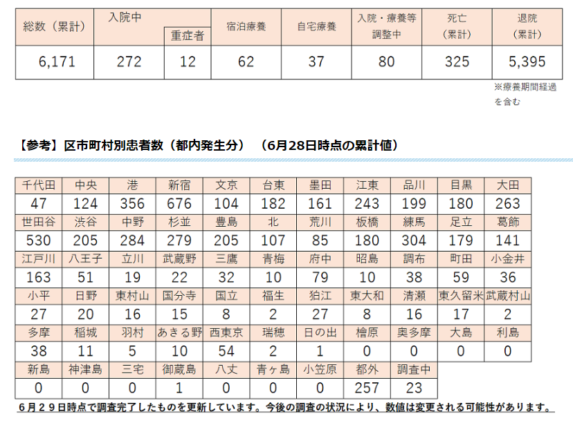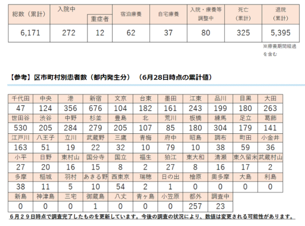 区市町村別の上位は6月28日の時点で、新宿区679人(+21)、世田谷区530人(+1)、港区356人(+3)、練馬区304人(+5)、杉並区279人(+2)となった。