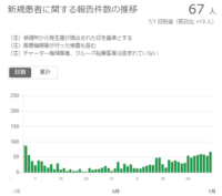 東京都は7月1日、都内の医療機関から報告された新型コロナウイルス感染症の新たな患者は67人、そのうち感染経路不明は20人などと発表した。6日連続50人を超え、緊急事態宣言解除後の最多を記録。年代別では20代が35人、30代14人で計49人。死亡は変わらず325人、患者総数は6292人。西東京市は前日より1人増の55人だった。