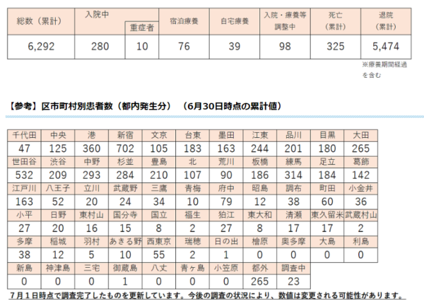 区市町村別の上位は6月30日の時点で、新宿区702人(+2)、世田谷区532人(+1)、港区360人(+1)、練馬区314人(+8)、杉並区284人(+4)となった。
