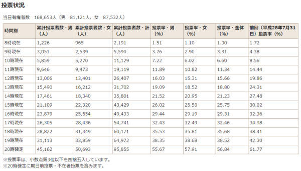東京都選挙管理委員会の発表によると、都内全体の投票率は55.00%となり、前回の59.73%を4.73ポイント下回った。