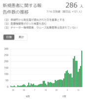 東京都は7月16日、新型コロナウイルスの感染者は286と発表した。前日より121 人増え、これまでの最多を記録した。感染経路不明は137人。20代139人、30代57人で計196人。死亡は326人、患者総数は8640人。新宿区は前日から8人増えて1207人となった。西東京市は4人増の78人だった。