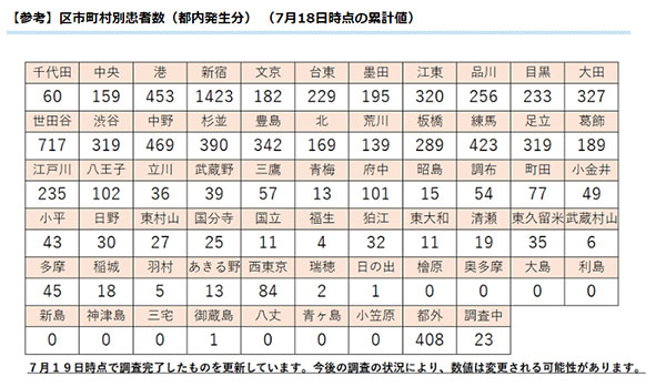 区市町村別の上位は新宿区1423人(+46)、世田谷区717人(+18)、港区453人(+17)、中野区469人(+13)、練馬区423人(+12)、杉並区390人(+10)、豊島区342人(+15)などだった。