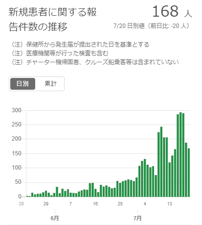 東京都は7月20日、新型コロナウイルスの感染者は168人と発表した。2日連続100人台となった。感染経路不明は94人。西東京市は2人増えて86人だった。