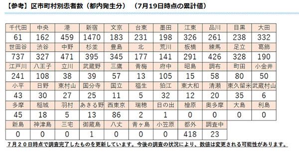 (編注:区市の後のカッコは前日比。新型コロナウイルス患者数は当日「都内の医療機関から感染症の症例が報告された」分、区市町村別患者数は「都内発生分累計値」の前日データ。「当日時点で調査完了したものを更新」としている。)