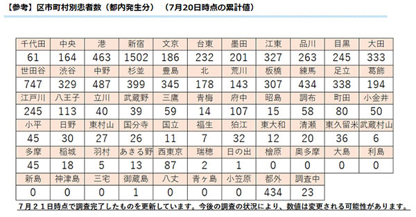 区市町村別の上位は新宿区1502人(+32)、世田谷区747人(+10)、中野区487人(+16)、港区463人(+4)、練馬区434人(+8)、杉並区399人(+4)、豊島区345人(0)などだった。