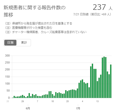 東京都は7月21日、新型コロナウイルスの感染者は237人と発表した。100人台は2日で終わった。感染経路不明は120人。西東京市は1人増えて87人だった。