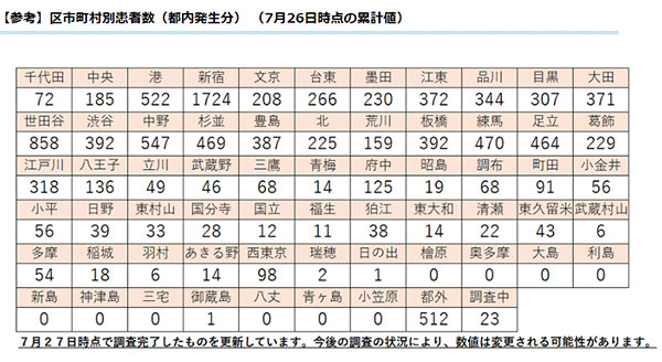 (編注:区市の後のカッコは前日比。新型コロナウイルス患者数は当日「都内の医療機関から感染症の症例が報告された」分、区市町村別患者数は「都内発生分累計値」の前日データ。「当日時点で調査完了したものを更新」としている)