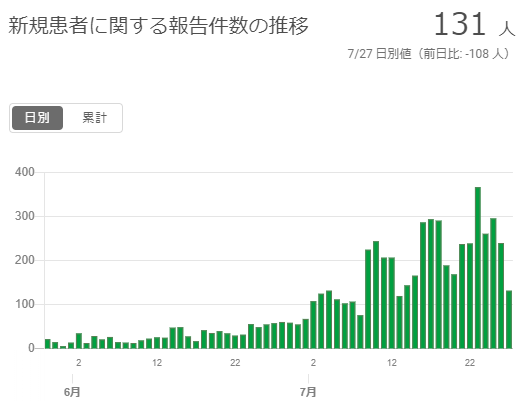 東京都は7月27日、新型コロナウイルスの感染者は131人と発表した。前日より108人減少し、200人以上は6日で止まったが、100人以上は19日間続いている。感染経路不明は79人。死亡は累計328人。患者総数は1万1345人。西東京市の感染は前日より2人増の98人となり、再び増加に転じた。