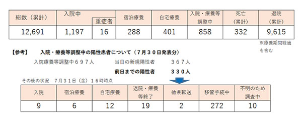 都の患者総数1万2691人のうち入院1197人(うち重症16人)、宿泊療養288 人、自宅療養401 人、入院・療養調整中858人。死亡は2人増の332人、退院9615人となっている。