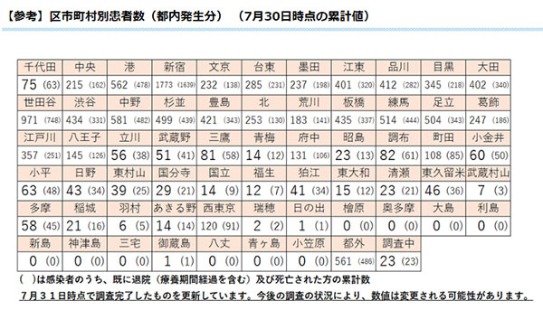 (編注:区市の後のカッコは前日比。新型コロナウイルス患者数は当日「都内の医療機関から感染症の症例が報告された」分、区市町村別患者数は「都内発生分累計値」の前日データ。「当日時点で調査完了したものを更新」としている)