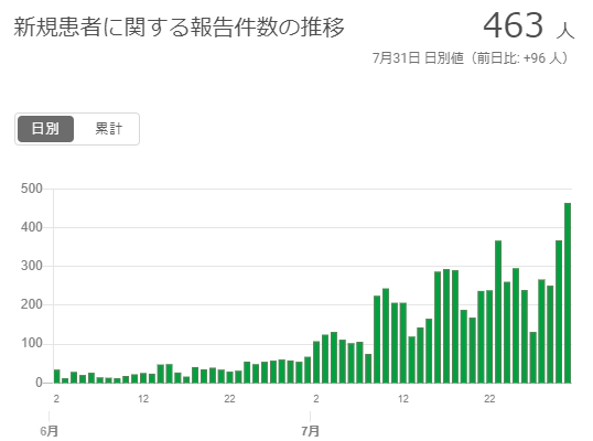 東京都は7月31日、新型コロナウイルスの新規患者は463人と発表した。前日より96 人増え、初めて400人を突破して過去最多を2日連続更新した。西東京市は9人増えて120人となり、7月1ヵ月で65人増えた。