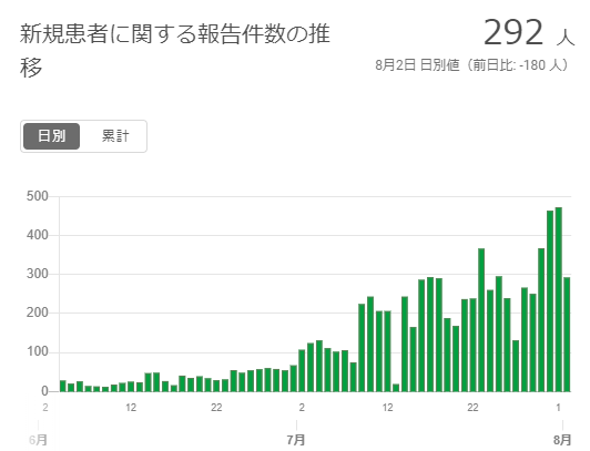 東京都は8月2日、新型コロナウイルスの新規患者は292人と発表した。400人超は2日止まりだったが、200人超は6日続いている。西東京市は6人増えて128人となった。