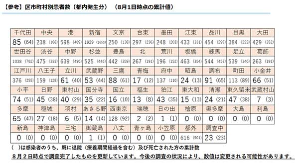 (編注:区市の後のカッコは前日比。新型コロナウイルス患者数は当日「都内の医療機関から感染症の症例が報告された」分、区市町村別患者数は「都内発生分累計値」の前日データ。「当日時点で調査完了したものを更新」としている)