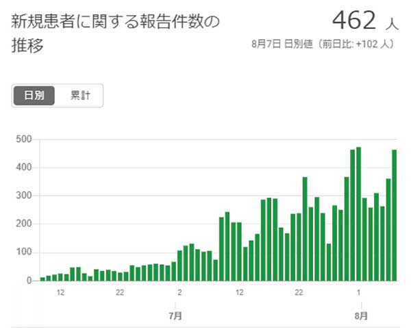 東京都は8月7日、新型コロナウイルスの新規患者は462人と発表した。前日比102人増となって6日ぶりに400人を超え、過去3番目に多い。西東京市は1人増の135人となった。