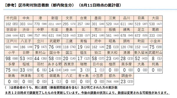 東京都の8月12日発表によると、西東京市の新型コロナウイルス感染者は前日と同じ149人。8月4日以来続いていた拡大が8日間で止まった。隣接の小平市は1人増の98人、東久留米市は前日と同じ52人。練馬区は17人増えて678人だった。