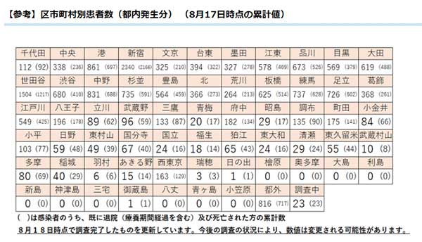 東京都の8月18日発表によると、西東京市の新型コロナウイルス感染者は前日と変わらず163人だった。内訳は、退院などが2人増の129人、入院・療養中は34人と2人減だった。隣接の小平市103人、東久留米市55人、清瀬市29人で変わりなかった。練馬区は5人増えて737人になった。