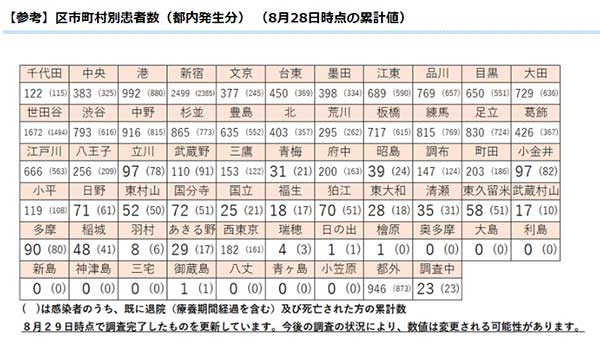 東京都の8月29日発表によると、西東京市の新型コロナウイルス感染者は182人になった。前日から2人増、1週間前8月22日の172人から10人増となる。退院・自宅療養終了、死亡などは累計で161人となり、この日の新規感染を含む入院・自宅療養などは21人だった。