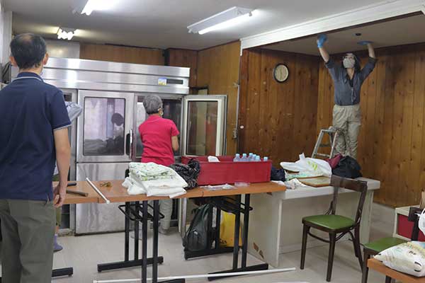 提供するのはインスタントやレトルトの食品、お菓子やジュースなどのほか、お米やスパゲティーなども予定。大掃除が一段落したあと、「あそこの会社は提供してくれないかしら」「会社や団体回りしましょうよ」など食品確保の段取りを話し合っていた。