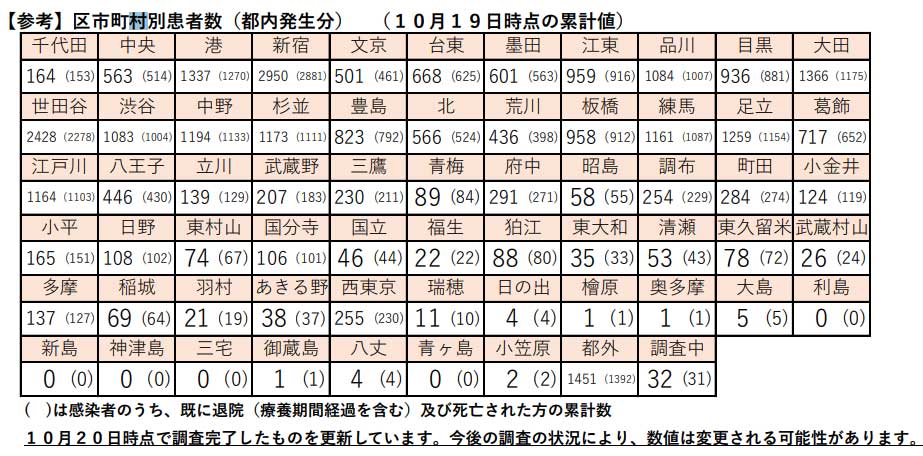 区市町村別の感染者累計は、20日発表によると西東京市は255人だが、それより多いのは八王子市446人、調布市291人、町田市284人だった。近隣では練馬区1161人、小平市165人、東久留米市78人、清瀬市53人などとなっている。