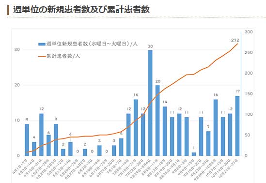 西東京市は10月27日、新型コロナウイルス感染者が累計で272人と発表した。21日からの1週間で17人増えた。感染者のうち退院などが251人。他の21人の内訳は入院11人、宿泊療養5人、自宅療養5人となっている。東京都の公表に伴って西東京市がホームページで明らかにした。