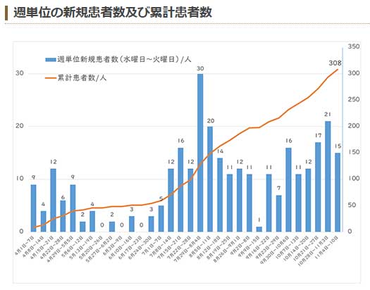 西東京市は11月10日、市内の新型コロナウイルス感染者が累計で308人になったと発表した。11月4日から10日までの1週間で感染は15人増えた。累計感染者のうち既に退院などしたのは282人、入院や宿泊療養、自宅療養などは26人になる。