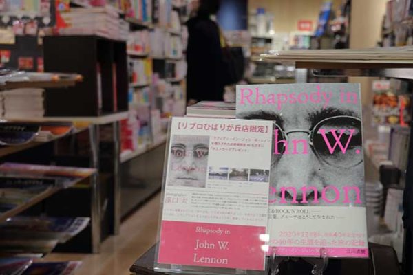 PARCO4階の書店「リブロ」店頭には、入荷した「ラプソディ・イン・ジョン・W・レノン」が飾られている。松本剛店長は「予約も入っています。息長く売れ続ける本だと思います」と話している。パネルは書店の斜向かい、4階エスカレーター前に飾られている。