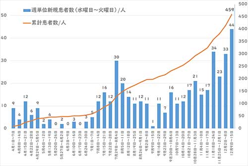 西東京市は12月15日、新型コロナウイルス感染者は14日時点で累計459人となり、前週より44人増えたと発表した。週間感染数は今年4月以降、最多となった。