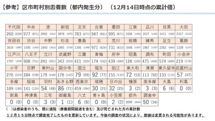 東京都の発表によると、14日時点の累計感染者数の最多は新宿区3878人、次いで世田谷区3634人など。多摩地区は八王子市908人、町田市574人、調布市475人、西東京市459人、府中市439人など。近隣は練馬区1987人、三鷹市411人、武蔵野市343人、小平市276人、東久留米市133人、清瀬市113人などとなっている。