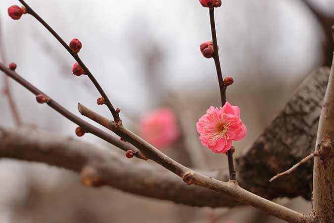 1週間ほど前は目立たなかった公園の梅が、17日午後は枝先に2輪、3輪と花を咲かせている。つぼみも膨らみ、春到来を待ちきれないように見えた。寒暖を繰り返しながら、春の足音が聞こえる。そんな季節を実感した。