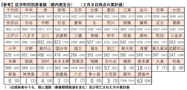 23区の累計感染はトップが世田谷区の7822人、新宿区6319人など。多摩地区は八王子市2081人、町田市1831人、調布市1234人、府中市1115人、西東京市1018人など。