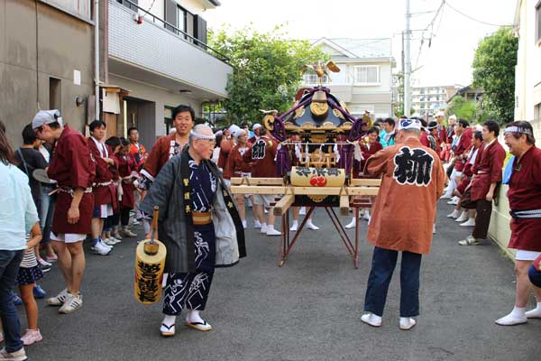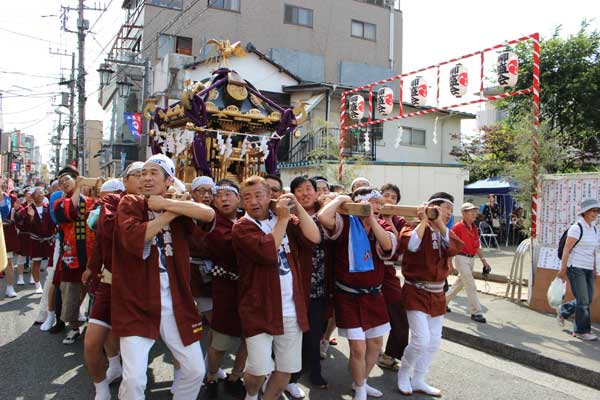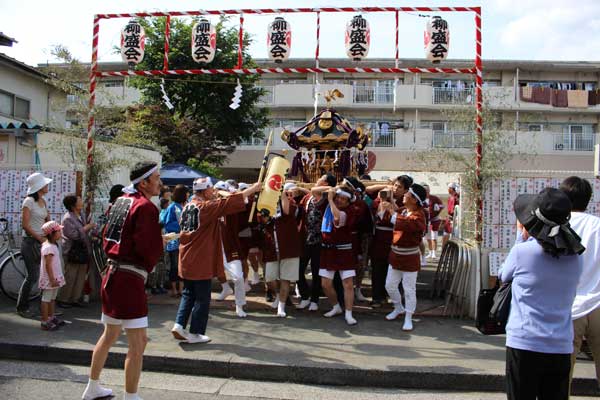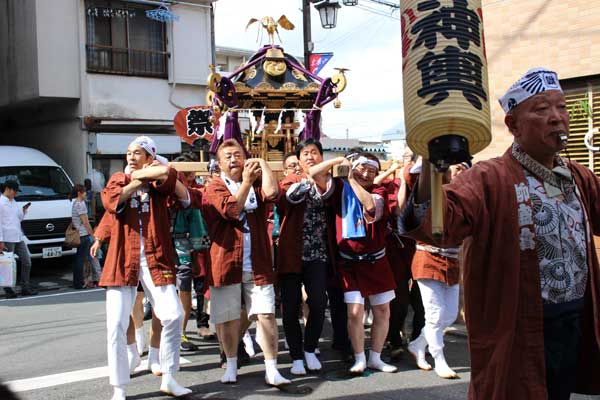 午後3時過ぎ、約40人の法被姿の男女が、重さ200キロ余りの神輿を担ぎ、通り沿いの「ほうやちょう保育園」広場を出発した。2キロほどの商店街を3時間ほどかけて「わっしょい、わっしょい」。店舗の前では商売繁盛などを祈願する神輿降りが行われ「奉納、奉納」という威勢の良い掛け声が辺りに響いた。