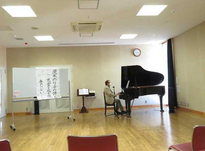 休憩後に、大場誠司さん作曲「木は旅が好き」「花ゲリラ」を5人の方が合唱でお披露目。優しいメロディーだ。8月の集いで発表するが、まだ「合唱団員」は少ないため、歌の好きなメンバーを募っている。その後、大場さんのピアノ弾き語りで、「生きているもの・死んでいるもの」(吉岡しげ美作曲)。楽譜がないためCDから採譜という熱心さ。これも茨木のり子に触発される楽しさに違いない。