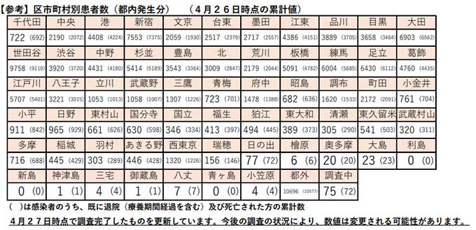 東京都発表による4月26日時点の区市町村別累積感染者は、世田谷区が9758人、新宿区7553人、大田区6903人など。多摩地区は八王子市3221人、町田市2172人、調布市1620人、府中市1478人、西東京市1320人などとなっている。